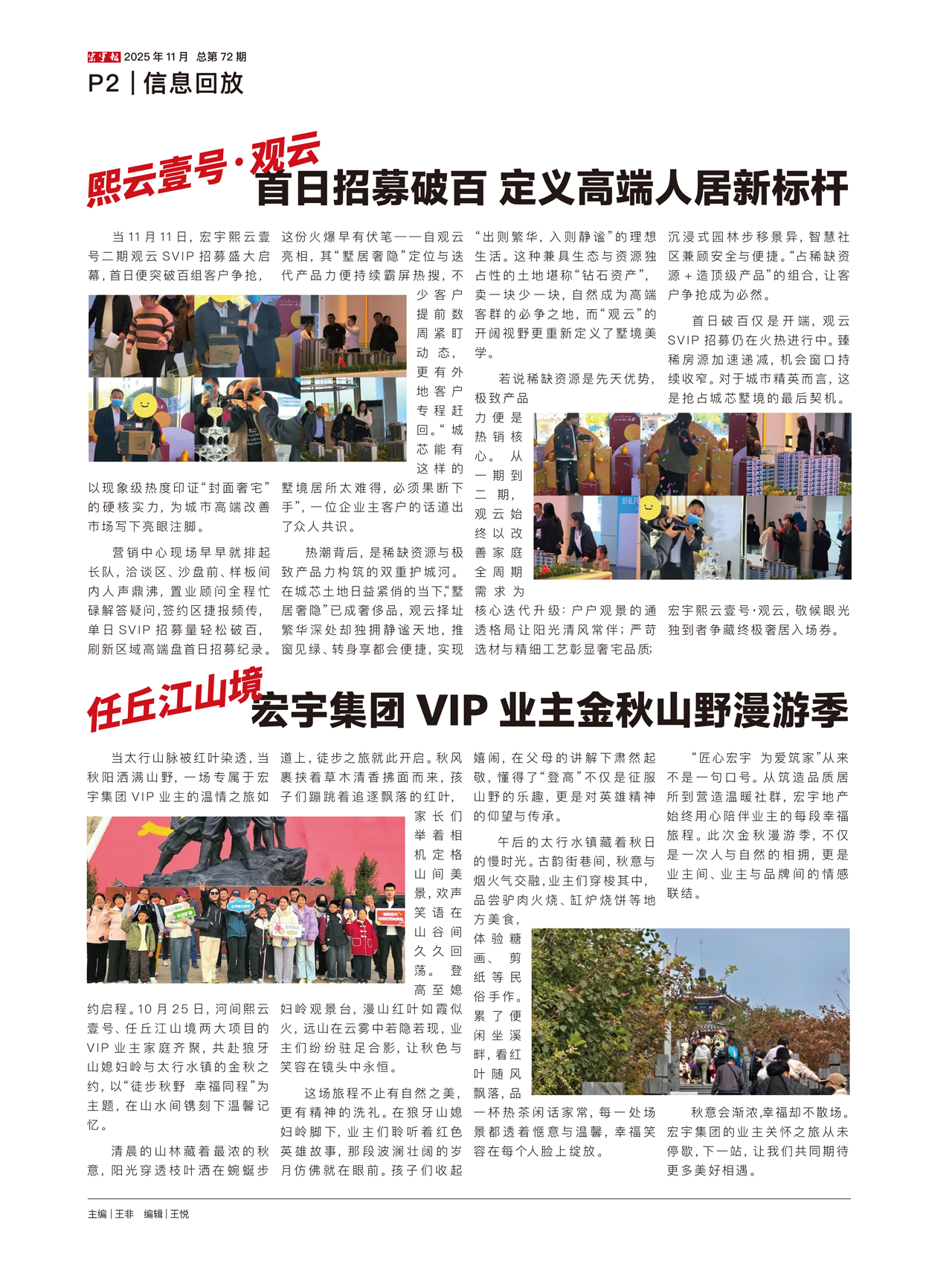 宏宇集团VIP业主金秋山野漫游季:10月25日河间熙云壹号、任丘江山境业主共赴狼牙山媳妇岭+太行水镇,徒步赏红叶、感悟红色文化、体验民俗美食,深化情感联结。