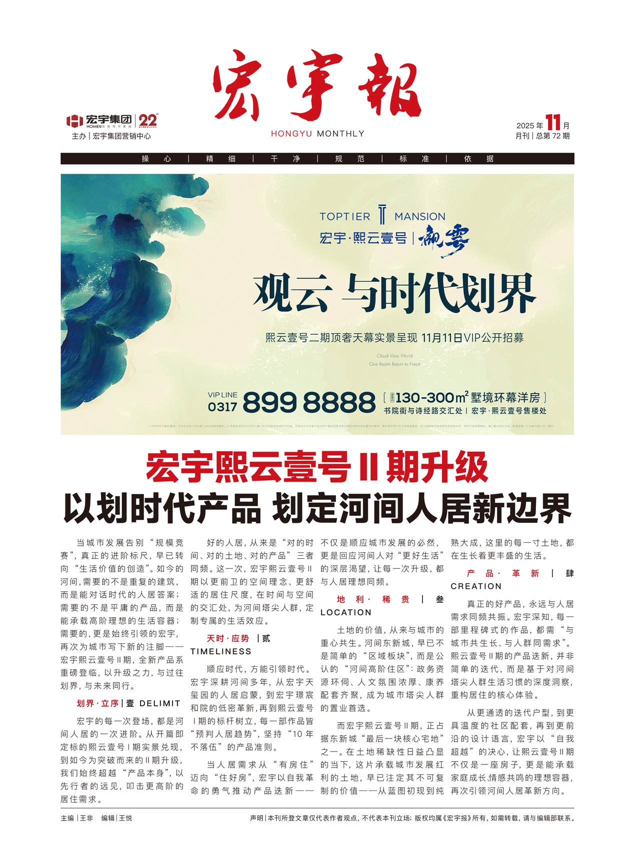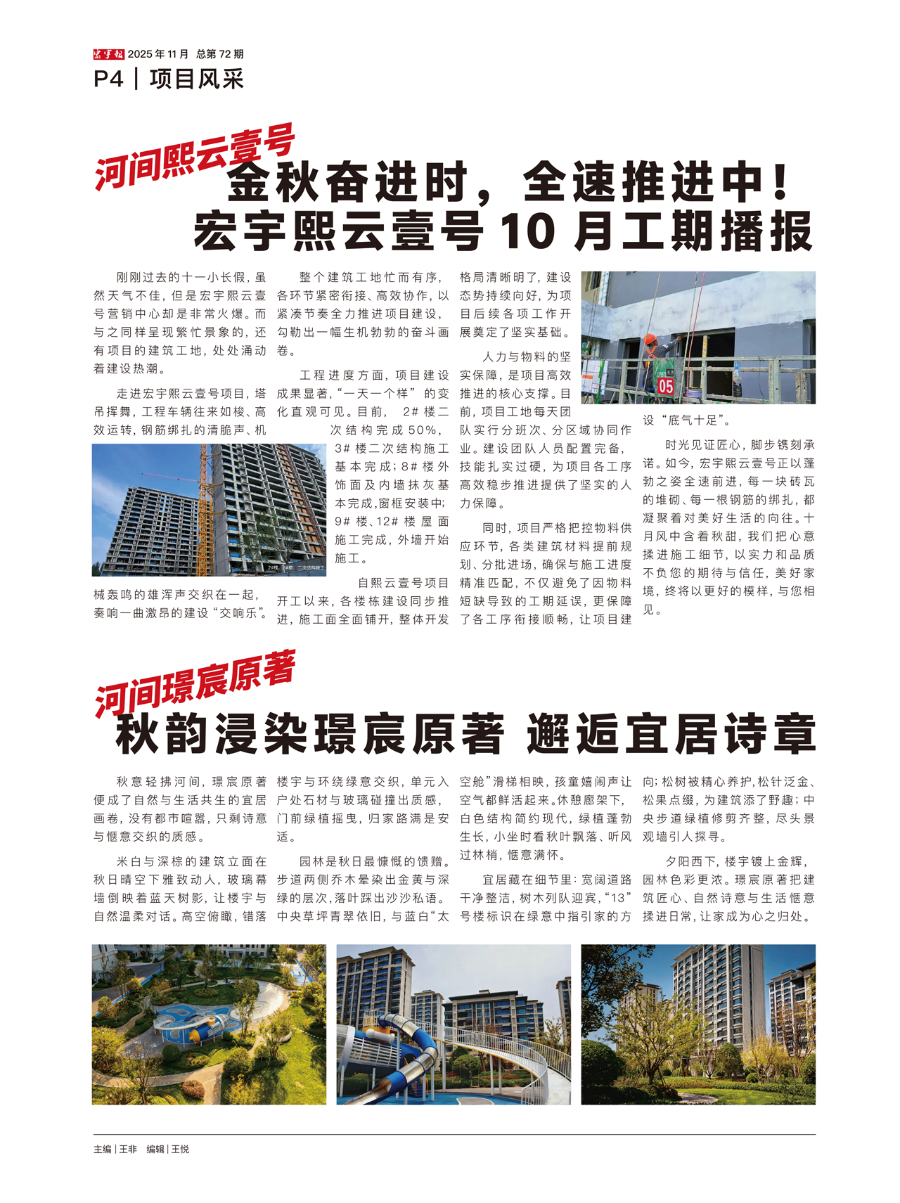 宏宇熙云壹号:10月施工全速推进,2#楼二次结构完成50%、3#楼基本完成,8#楼外饰面及内墙抹灰完成且窗框安装中,9#、12#楼屋面施工完成并启动外墙施工;Ⅱ期以“划时代产品”升级,占据河间东新城核心宅地,重构人居体验,11月11日顶奢天幕实景呈现并启动VIP招募。