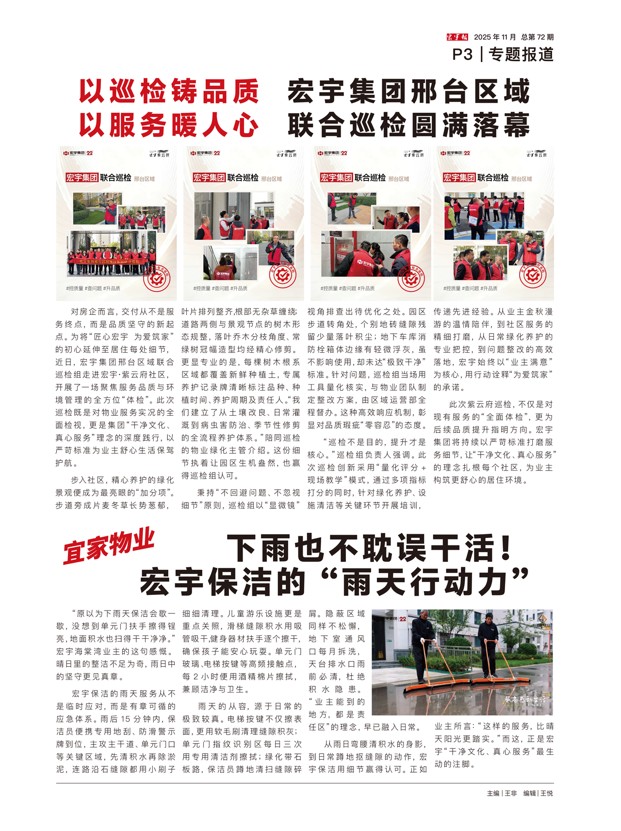 邢台区域联合巡检:走进紫云府社区,肯定绿化精细化养护亮点,指出地砖积尘、消防栓浮灰等细节问题,当场制定“扫+冲+擦”等整改方案,创新“量化评分+现场教学”模式落地“干净文化、真心服务”。