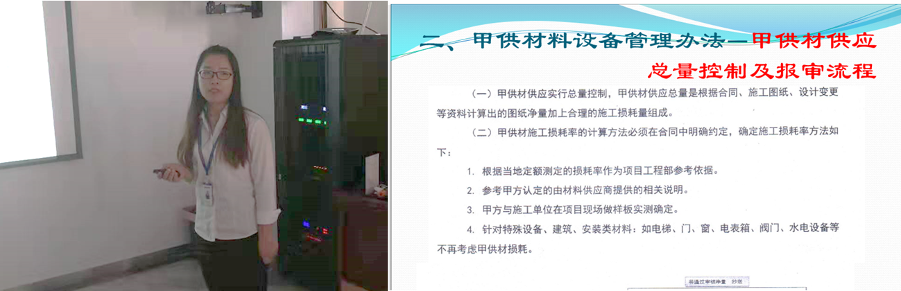 然后,由成本管理中心成本部庞会会老师为大家带来了《工程管理》的培训,庞老师重点讲解了签证管理办法和甲供材管理办法,培训后庞老师对学员的问题进行了专业的解答。